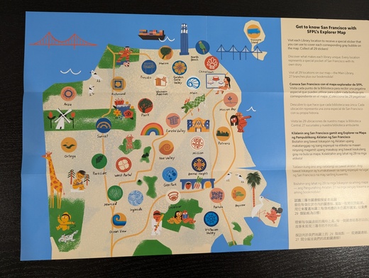 I spent a lot of time at the West Portal library branch growing up, and when I went inside a few months ago for old time’s sake, the man behind the desk offered me a San Francisco Public Library Explorer Map. The map of San Francisco has a little gray circle for each of the city’s 27 libraries, at which one can pick up a unique sticker for that library.