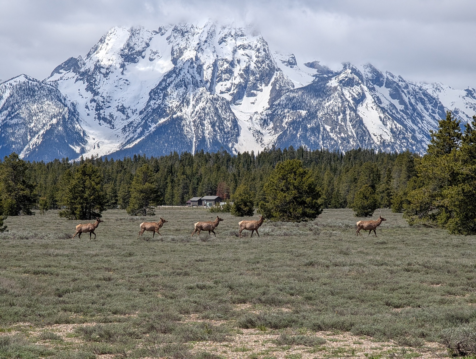 I crossed the western Continental Divide for the fifth time at Togwotee Pass and encountered my first snowstorm. It had been near-freezing at various points on the trip, and I’d encountered rain, but never both at the same time. I guess that’s what I should have expected at 9000+’. The snow turned into cold rain on the way down to Grand Tetons National Park, and the park ranger at the gate convinced me to buy some bear spray. I didn’t end up using it with bears, but I wish I’d had it for the dogs in Missouri!