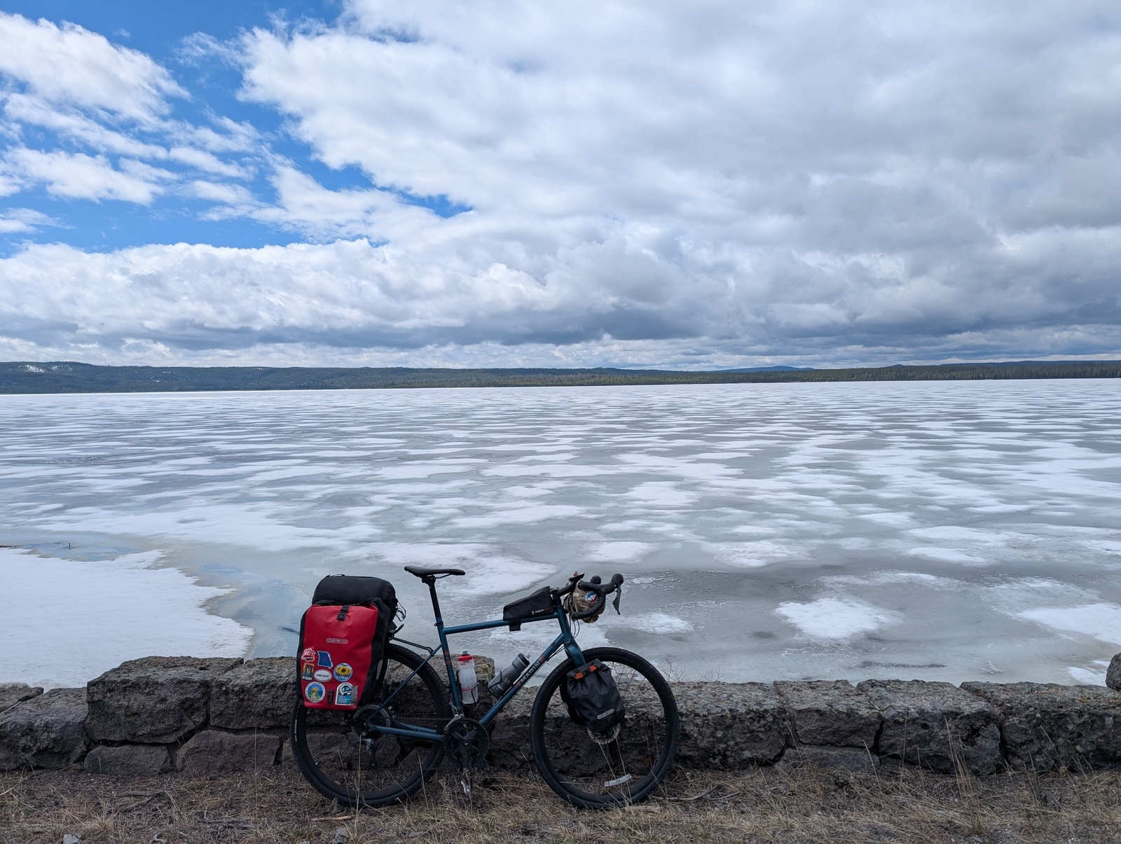 There was snow on the ground but fortunately not in the sky, and I crossed the Continental Divide three more times as I enjoyed the scenery and rolled into the Old Faithful Inn.