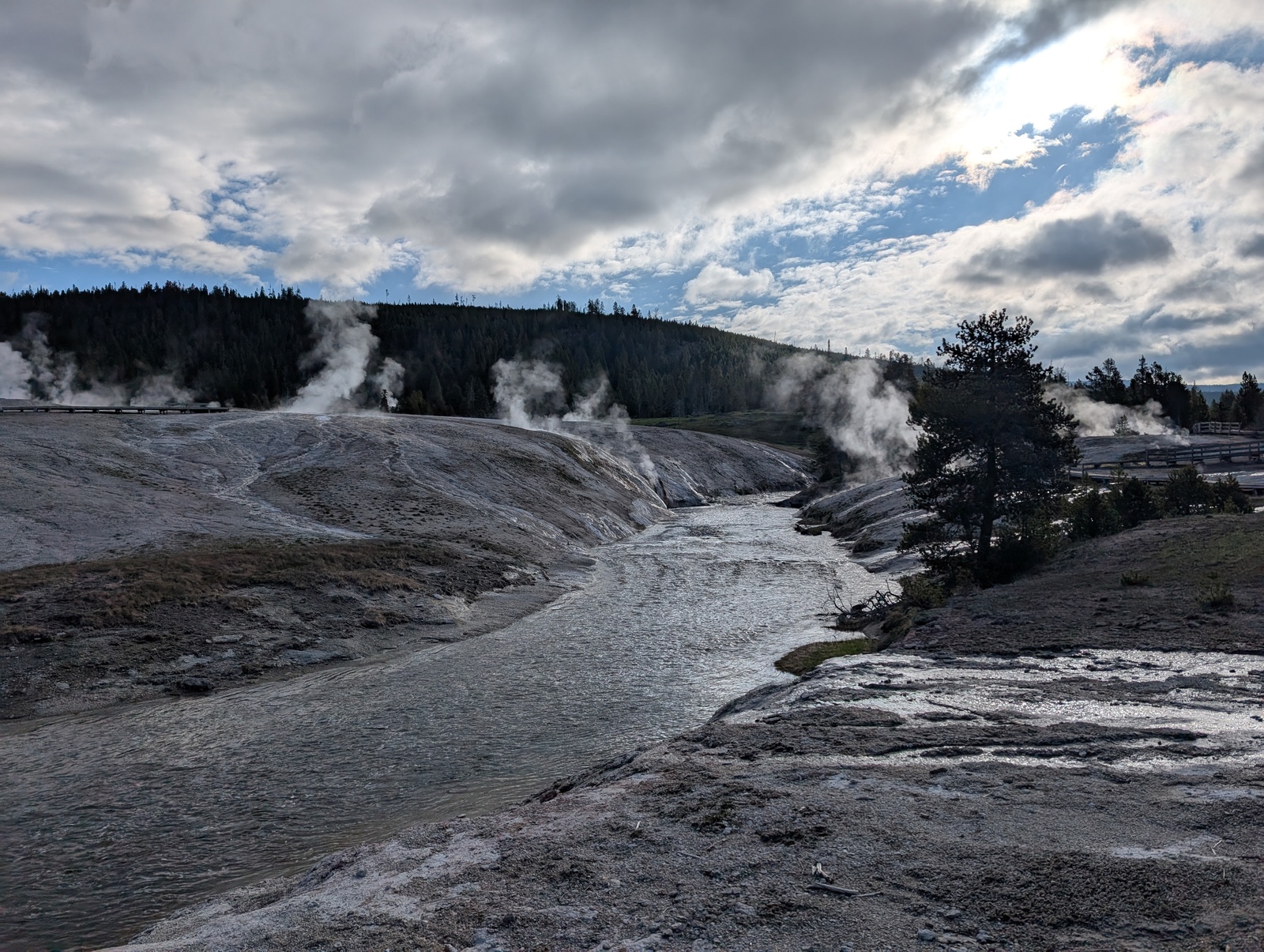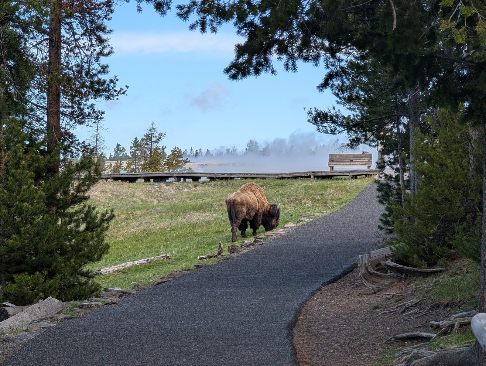 I wandered the geyser basin early the next morning and made a new friend, P. There were many fewer people than I’d expected in the park, which was somewhat understandable given the snow and a blessing to me as a cyclist on the road in a popular national park.