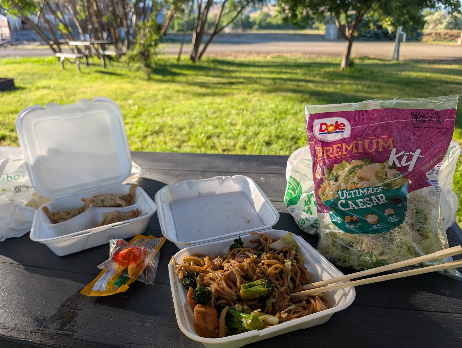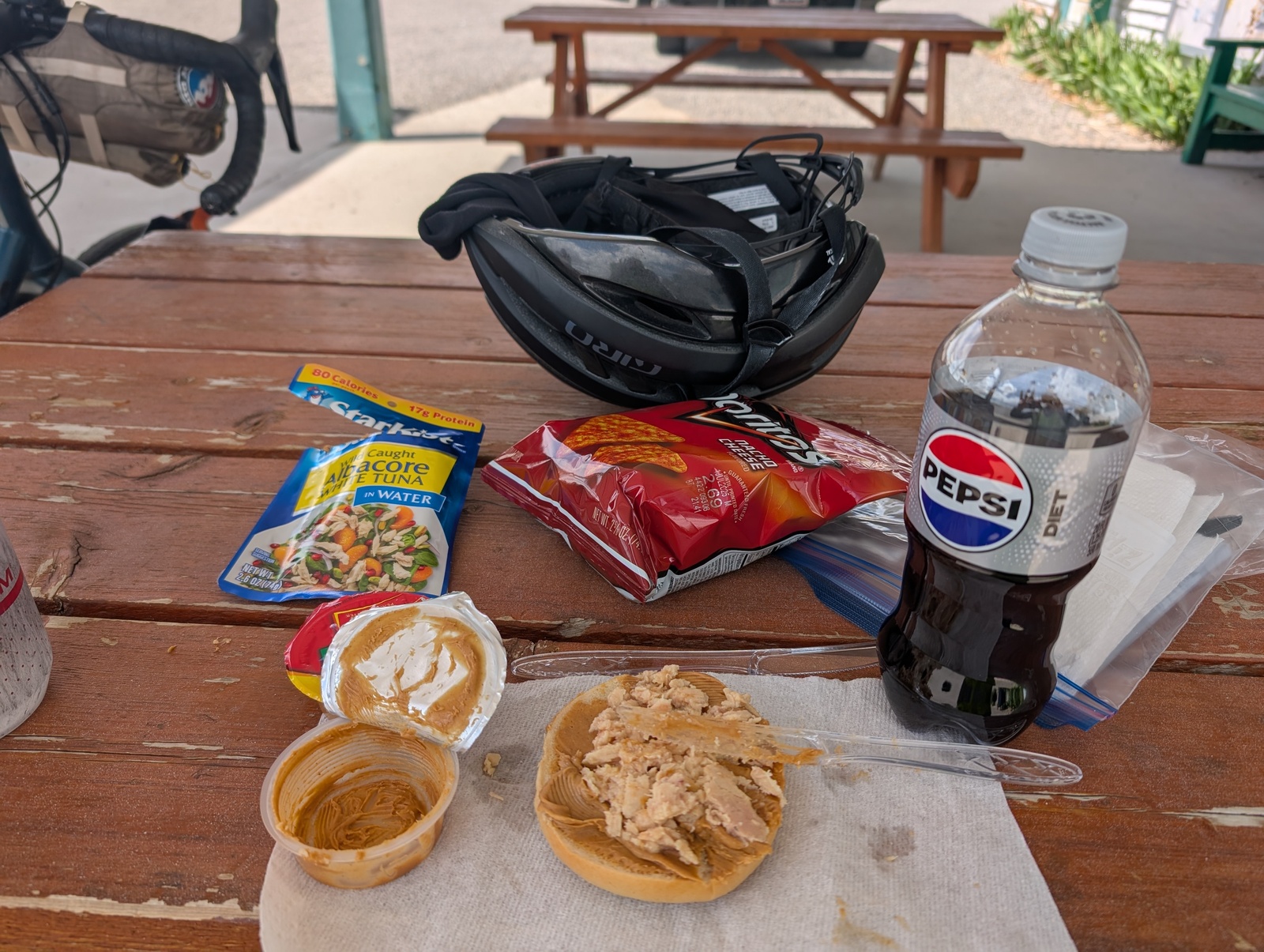 When camping or riding through places where I wasn’t guaranteed to be able to get food, I packed individual peanut butter servings, tuna, and bread. It wasn’t my favorite meal, but it certainly did the trick! Once, when camping, I found a Chinese restaurant and chowed down on chow mein with a side of bagged salad for the semblance of anything healthy.