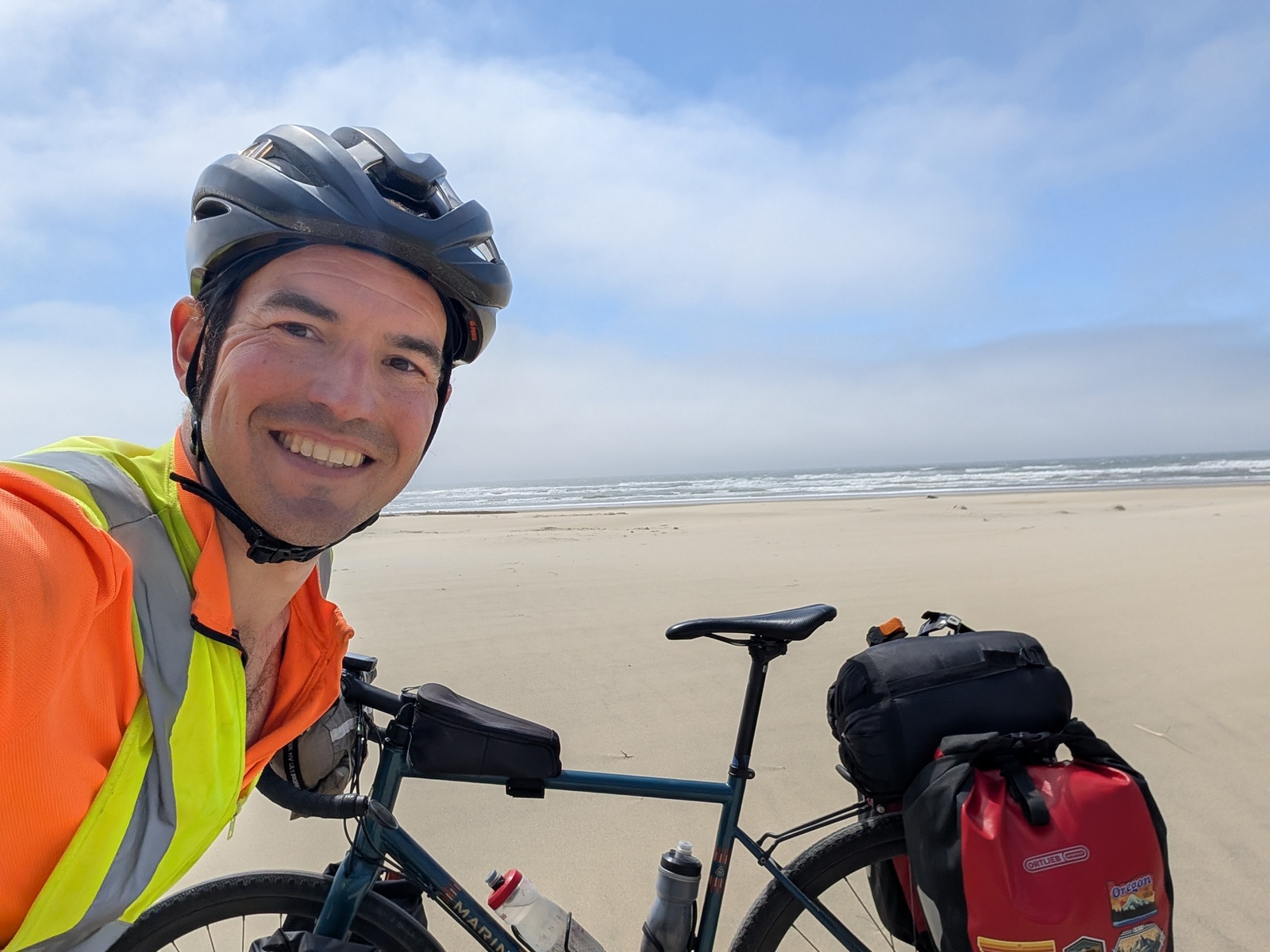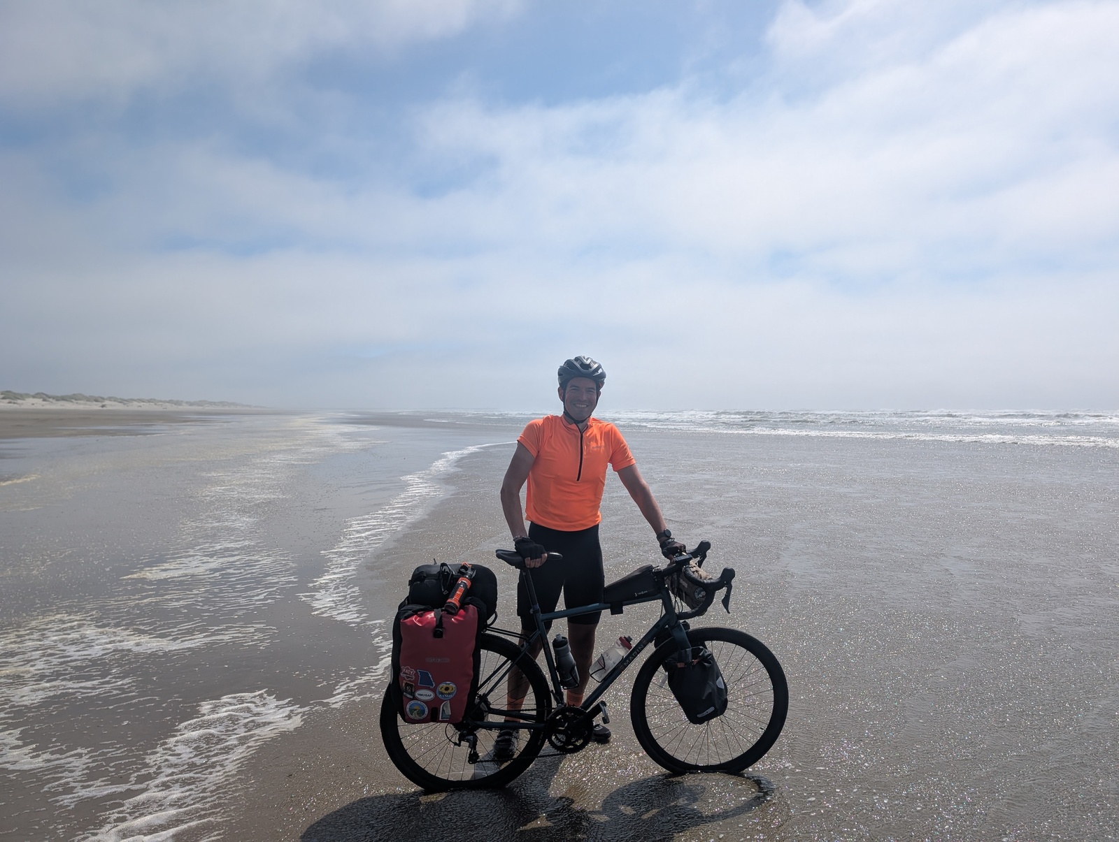 The last five miles to the beach were along Highway 1 with brutal headwinds and sand, and as I dragged my bike out to the beach, the bags acted like a sail and blew the bike around. Nothing is easy, kids. But hey, I made it!