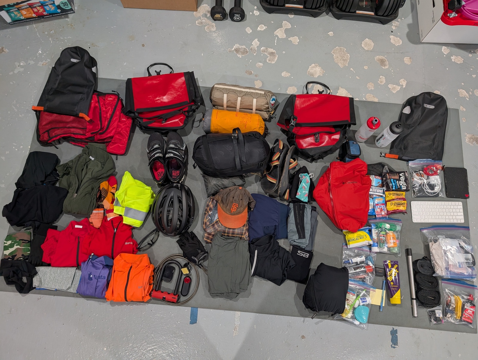 Notes: Should have packed extra cleats since SPD-SLs were so poorly suited for the type of travel I was doing. Duct tape roll was very helpful!
